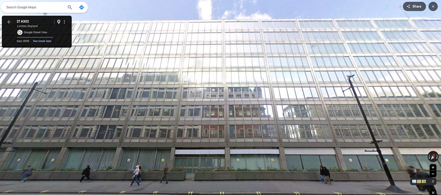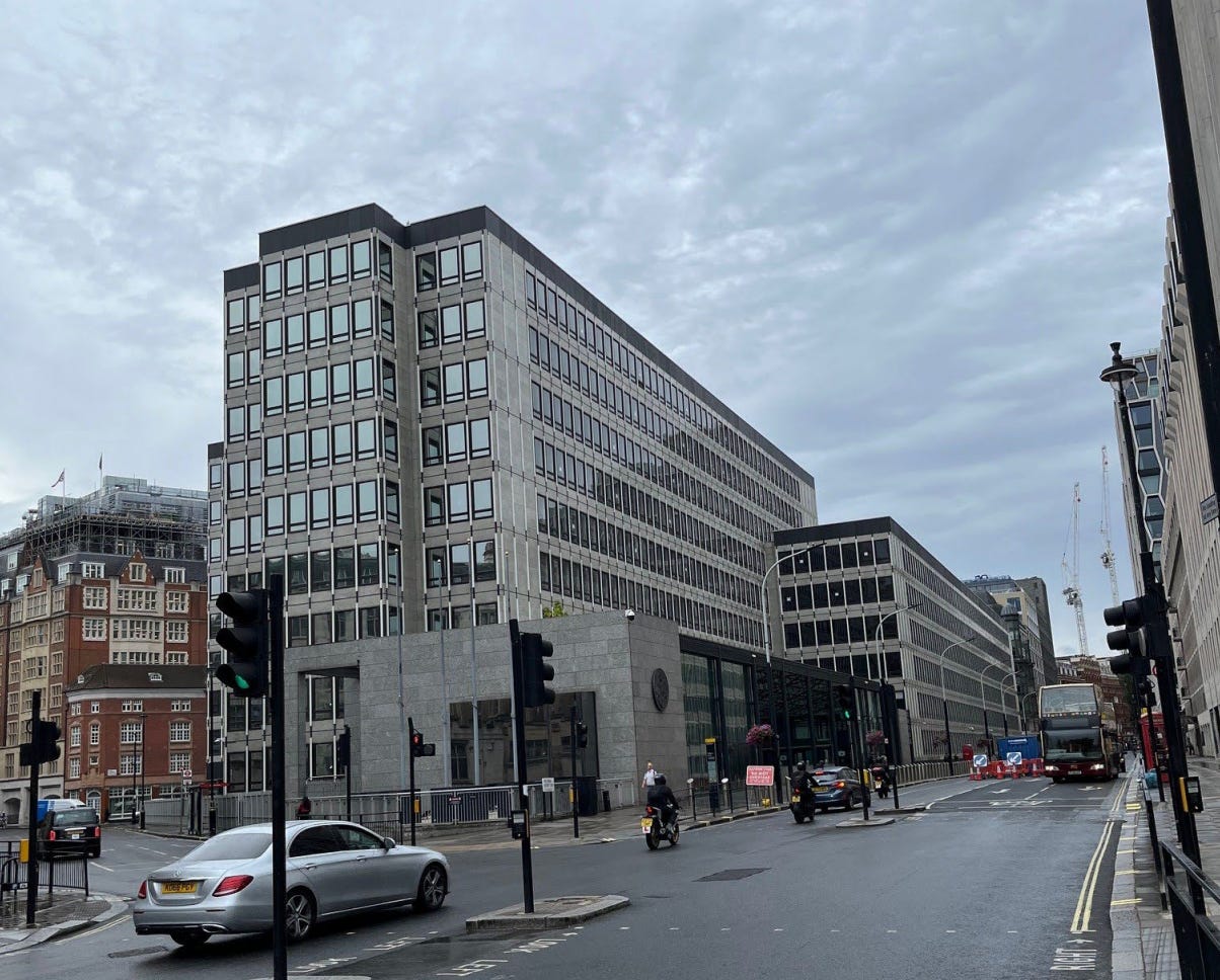 We begin at the east end of Victoria Street, leaving Parliament Square. On the left is 1 Victoria Street, a government office block that is currently disappearing under scaffolding for partial redevelopment. 1 Victoria Street reminds us of much that is bad in the architecture of the 1960s. Its problems begin with the shape of the plot, which is eccentric even by the standards of Victoria Street. This presented its designers with a challenge that they were ill-fitted to meet. Like many 1960s architects, they seem to have been incapable of planning in anything except rectangles. On an irregularly shaped plot like this, this meant they had to leave a series of dead spaces around the building in all the areas into which rectangles could not be fitted.