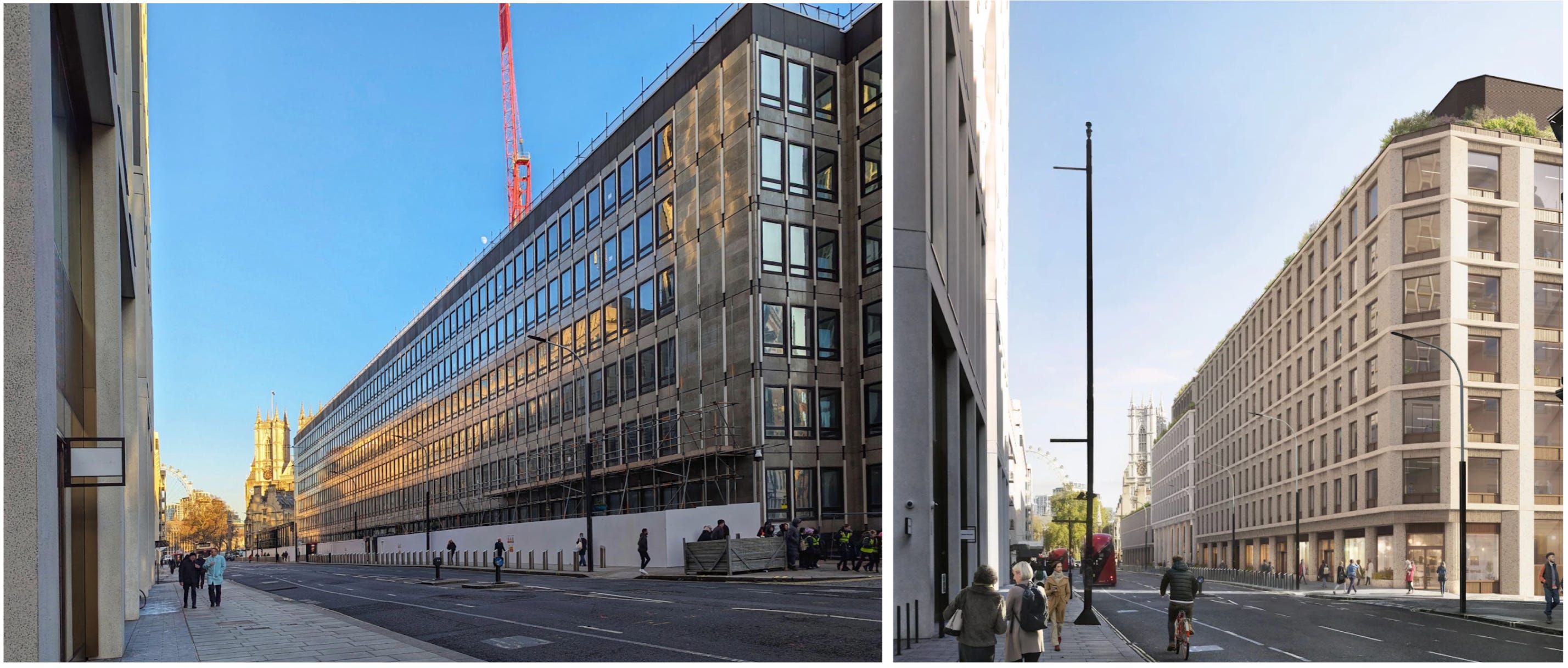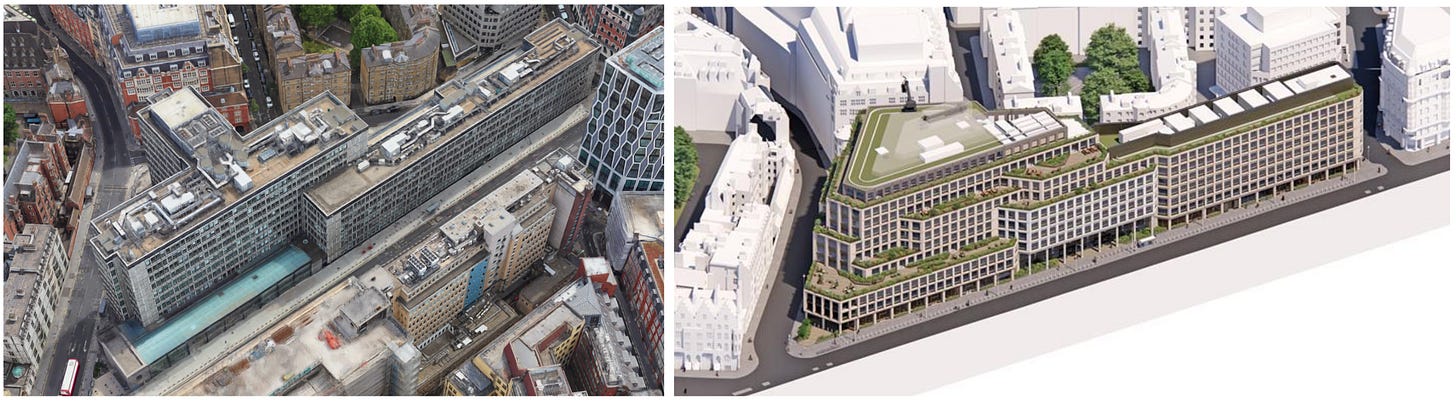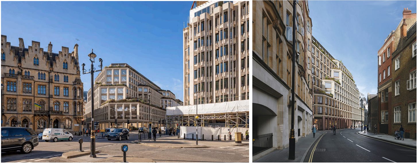 It is sad, and rather striking, that despite all this skill, the future 1 Victoria Street will not be one of the great buildings of London. Its chief problem is evident in the view along Victoria Street shown below: the architects have made almost no advance on the repetitively gridded treatment of the original facades. The facades have been broken up somewhat by the superior massing, but every available surface is still covered with an unvarying grid of windows. It is remarkable that architects who can compose a building in three dimensions with such obvious intelligence are so helpless when it comes to the much simpler task of two-dimensional composition.