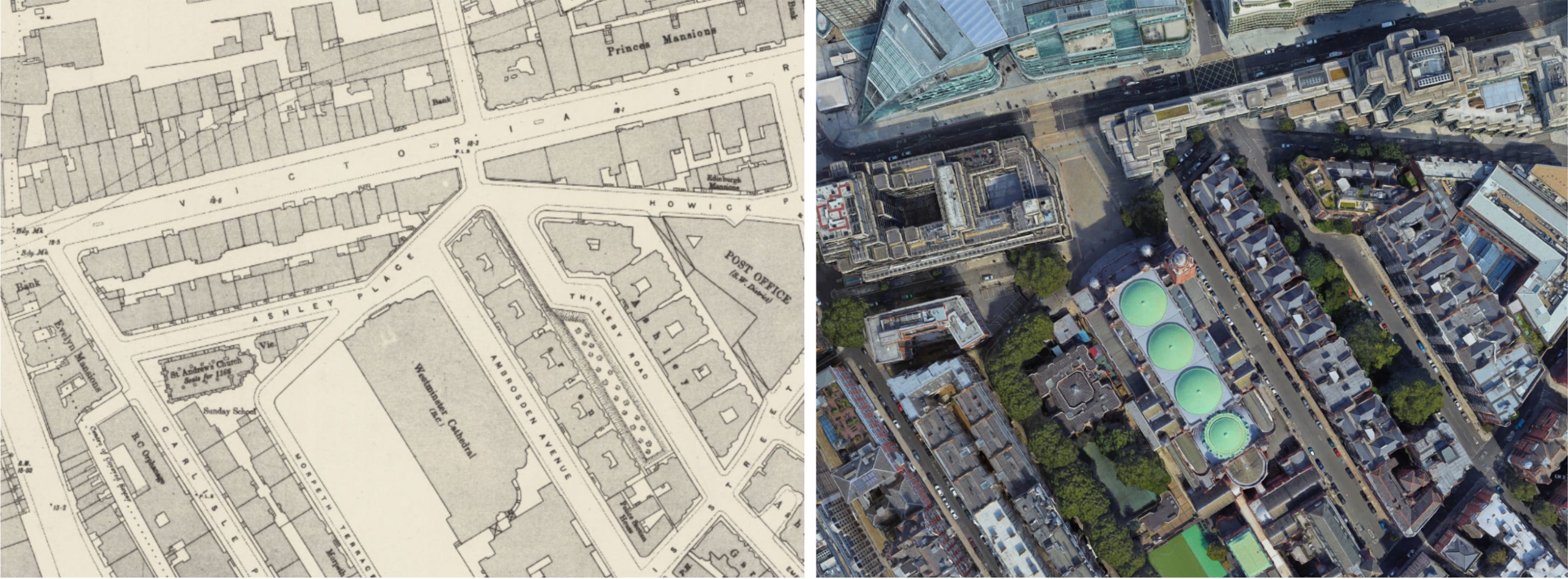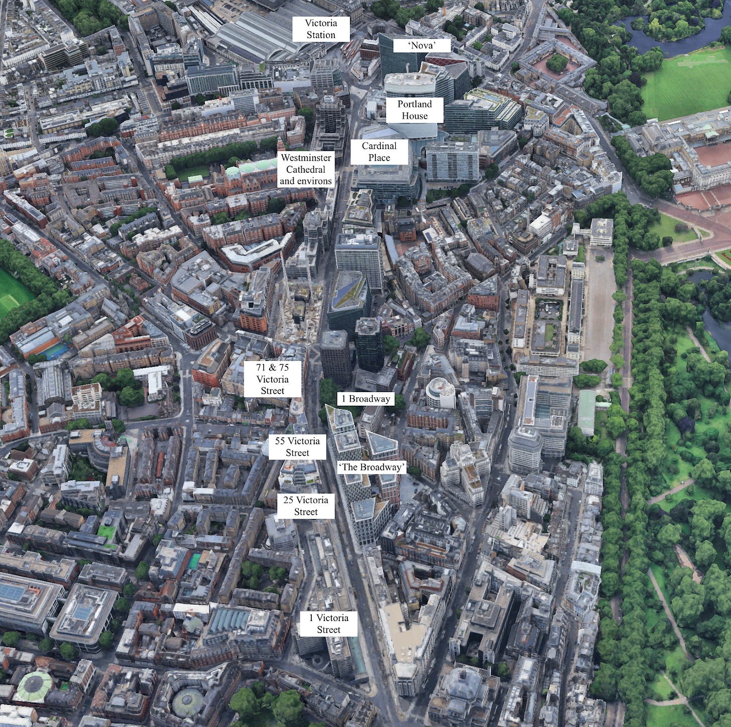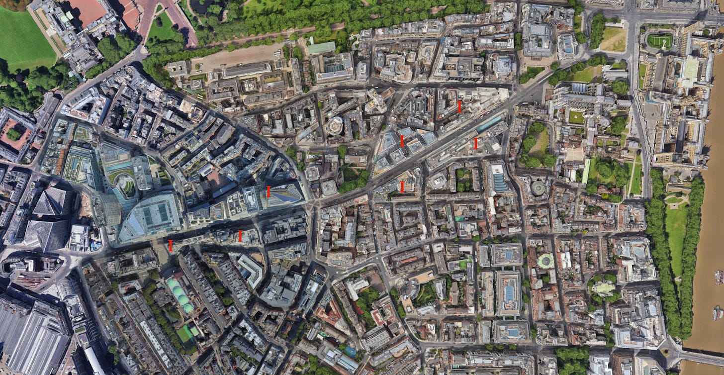 Victoria Street was cut through the fabric of Westminster in the 1840s. One of the giveaways of this is that many of the blocks around Victoria Street have strange shapes, like obtuse triangles and thin irregular polygons. I have marked these with the letter ‘I’ on the map above. Building on irregularly shaped plots tends to be more expensive, so private developers try to avoid them. But there was no way to create a straight arterial route without slicing through lots of blocks, leaving oddly shaped block segments for redevelopment.