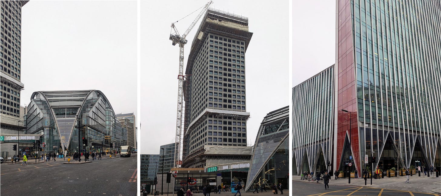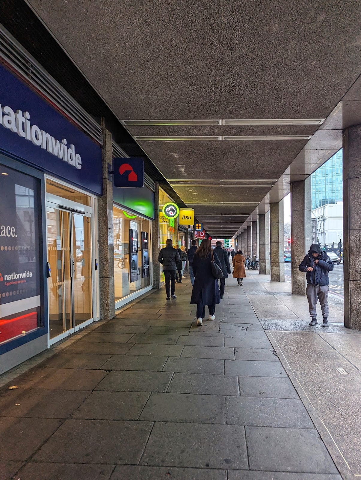 Both buildings are extended over the pavement, creating a colonnade. Pavement colonnades are a highly efficient urban form and can also be an appealing one, even at a gloomy latitude like England’s: this is proven by the colonnade at Covent Garden, which is widely admired. But they need to be very high-ceilinged and faced in a pale, handsome material; it also helps if they are oriented toward the south so that they catch direct sunlight. None of these things is true of the Victoria Street colonnades, which are dismal and oppressive places. This is the sort of architectural failure that gives urban density a bad name.