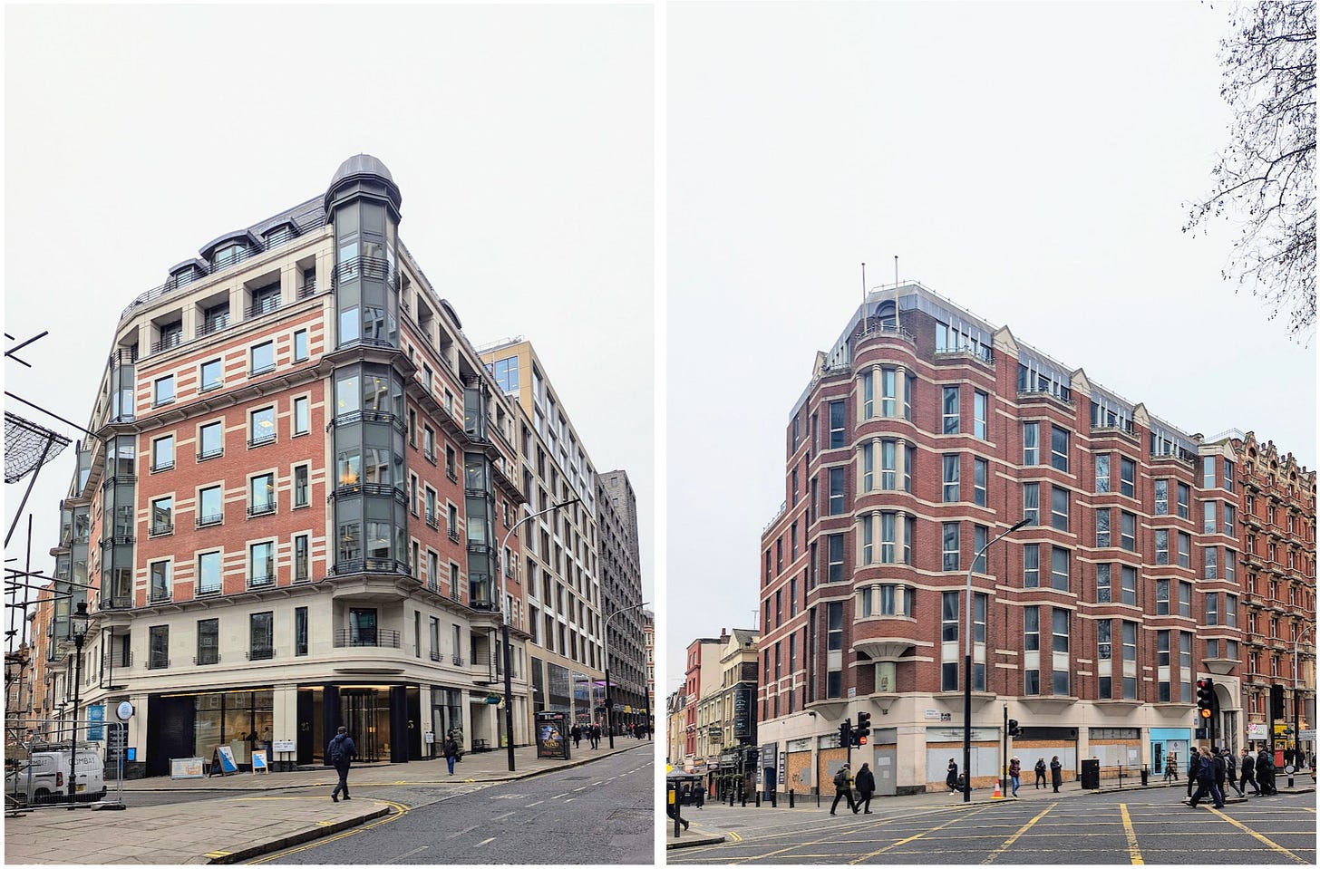 The next group of buildings shows some interesting types. We have two examples of late twentieth-century ‘postmodernism’, which in this context involved attempting to recover some Victorian architectural and urbanistic forms to humanise modern building types. Both buildings are obviously aesthetically unconvincing, but it is interesting to ask why this is so. The massing and facade composition is much the same as that of many good Victorian buildings, so it cannot be these. Many postmodern buildings have obviously cheap and ugly materials, but that doesn’t seem to be the problem here either: the buildings are faced in good limestone and a tolerable red brick, not much different to their Victorian neighbours.
