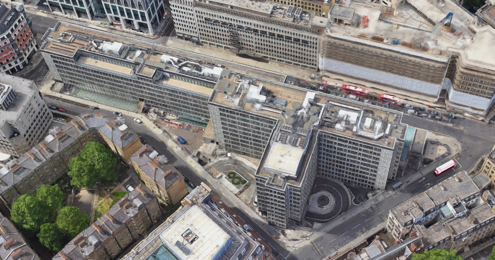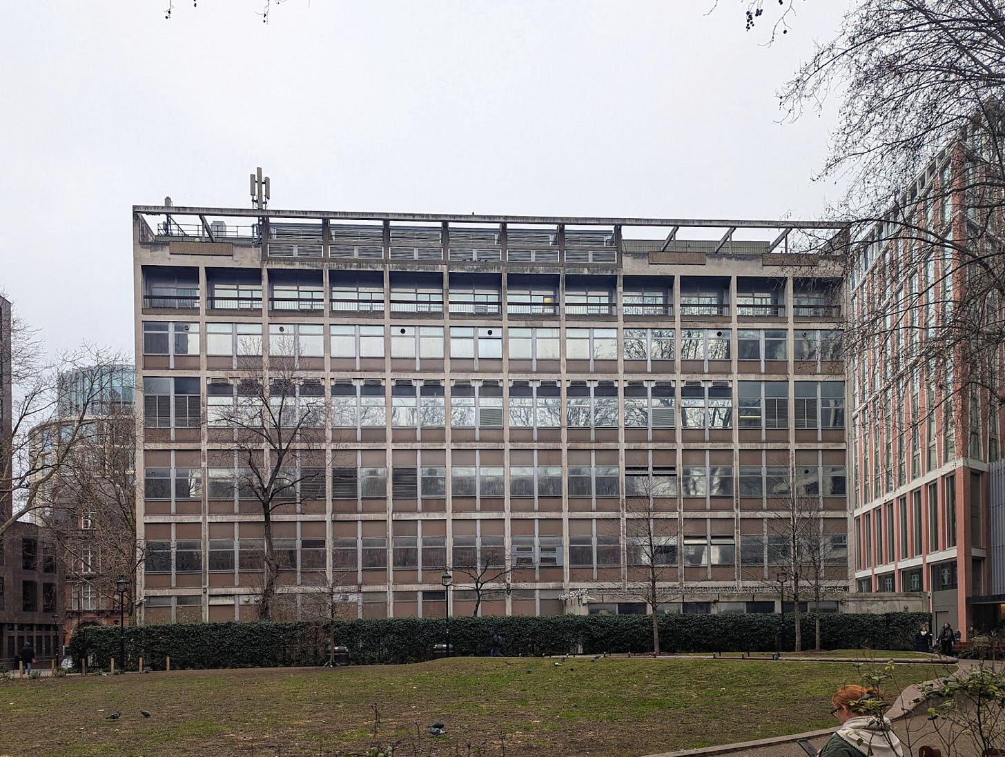 Advancing west, we come to a small park, popular as a lunch venue for office workers. In the bushes lurks an old monster. This is 1 Broadway, one of the area’s last survivors from the 1960s. Let us hope it is demolished before it attracts conservationist attention.