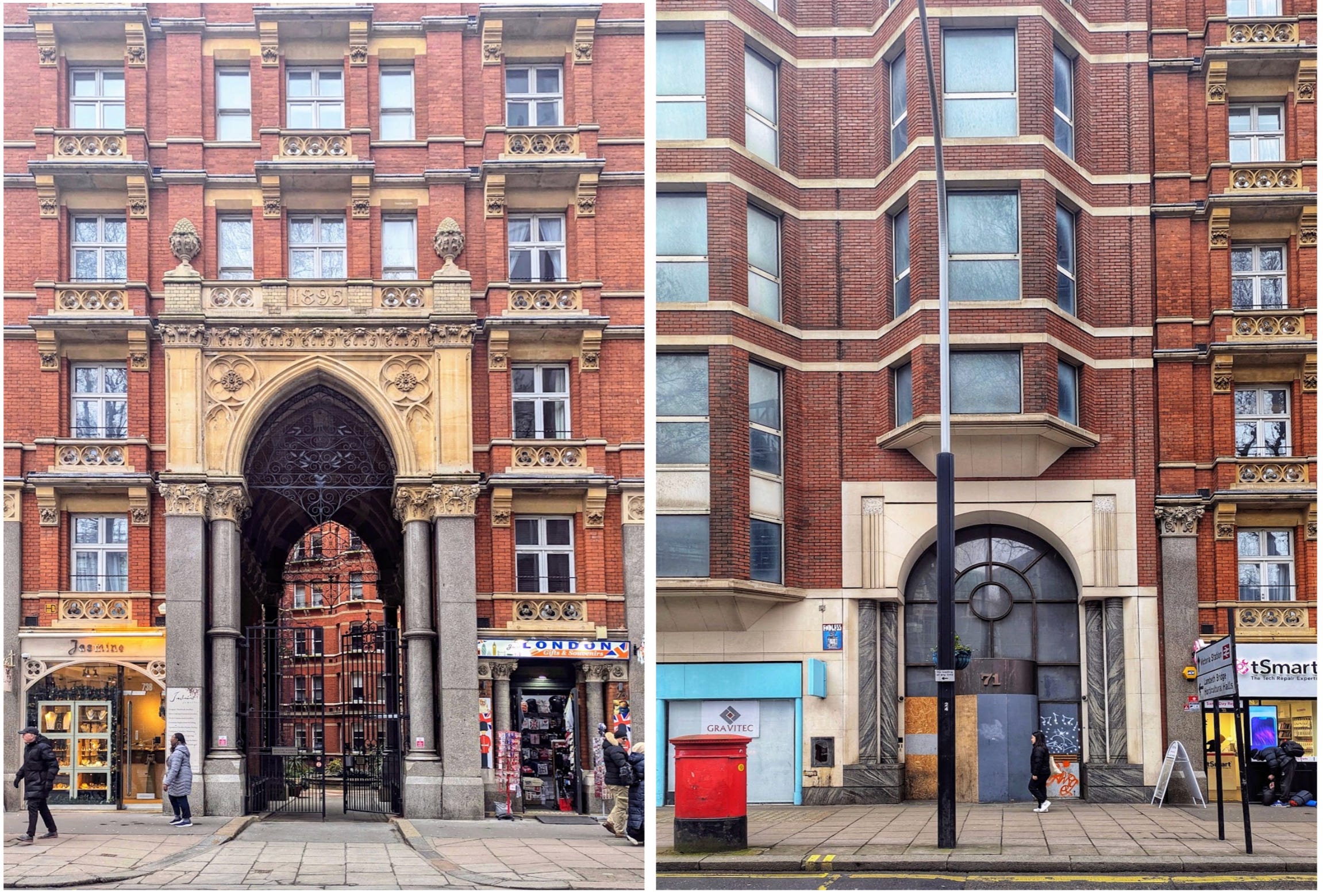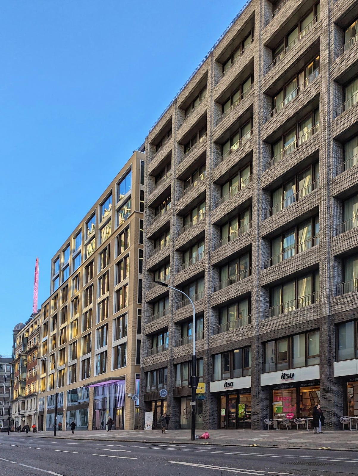 The failure, I think, is simply that they are badly detailed. This is particularly clear with 71 Victoria Street, because it stands next to and consciously tries to imitate the Victorian mansion block at No 75. Every detail of the unfortunate No 71 looks crude and shoddy by comparison, and every transition is clumsily handled. One is reminded anew of the vast loss of skills that took place between the 1940s and 1980s, such that a developer who attempted to emulate a Victorian precedent was unable to do so with even passable success. It is unsurprising to learn that No 71 is not long for this world.