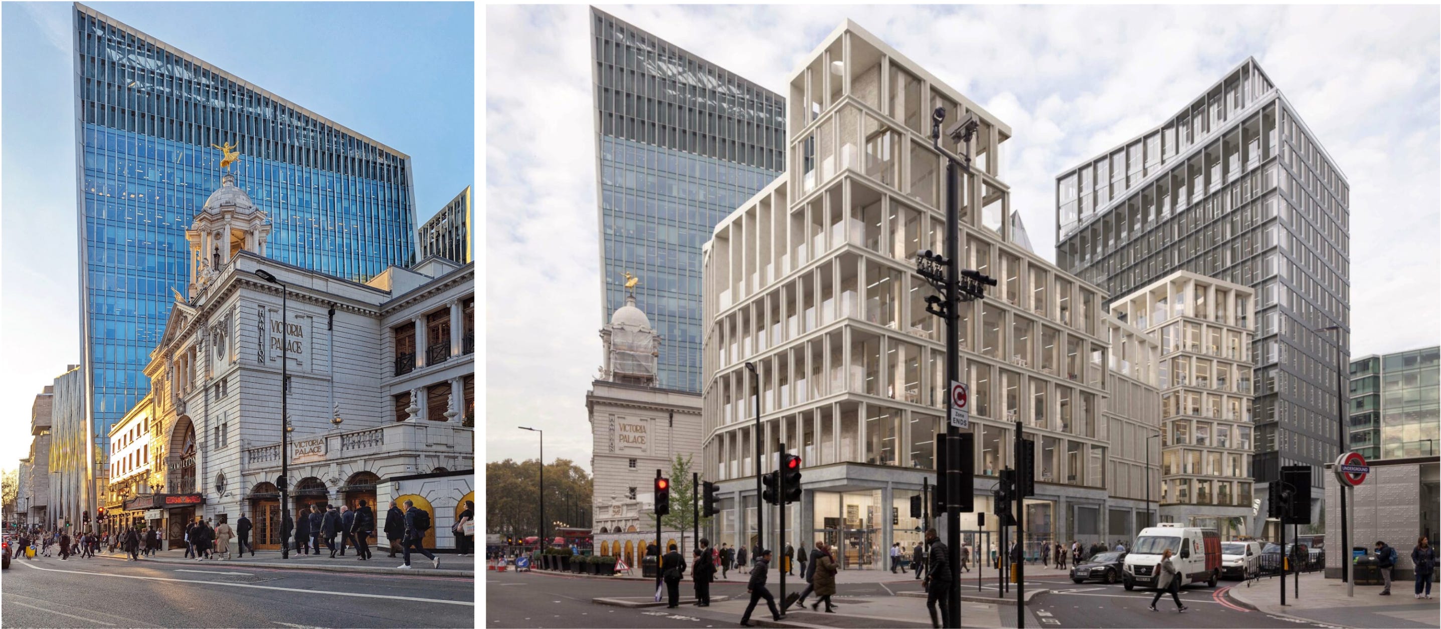 There are only a few points of comfort to be found in this area. One is Victoria Palace Theatre, by the prolific Edwardian theatre architect Frank Matcham, a tasteless but amiable design whose charms are enormously flattered by the bleakness of its surroundings. Perhaps there is also some comfort to be found in the new commercial buildings rising around it. Critics will see nothing here but more flavorless modern offices. But at least these buildings are sensitively massed, appearing as a sociable urban group rather than a monster-block; they use quiet tasteful materials and mild colors, and abstain from vulgar jokes and architectural chest-thumping. They give renewed hope that London’s commercial architecture is moving in a more civilized direction.