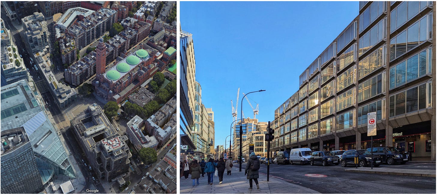 Consider Victoria Street, one of London’s forgotten road cuttings. Victoria Street is not much visited by tourists, and as we shall see, much of it is indeed very ugly. But its ugliness is varied in kind, and interspersed with remnants of former beauty and foreshadowings of future renewal. I find it extremely interesting.