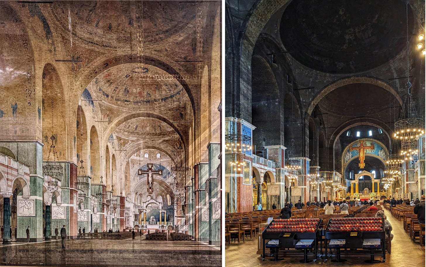 After renewed debate, the diocese turned to the English architect Francis Bentley, who designed today’s cathedral in a style that is usually called Neo-Byzantine. The interior of the building was to be expensively faced in gold mosaics, but funds ran out when the work was only partly done, leaving the raw black engineering brick of the domes exposed. The result violates the standard rule in architecture according to which buildings should become lighter and more refined as they rise. I like architectural rules and I think they are often useful. But I cannot deny the mysterious power of Westminster’s strange dark domes, hanging over the luminous gold and marble below.