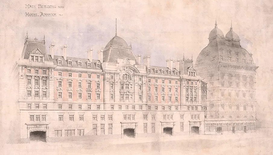 This building was designed by the railway company’s engineer, one Charles Morgan. It is a kind of slab block, nineteen windows wide and nine storeys high. In respect of its underlying volume it is thus similar to the various modern blocks we have examined, somewhere between 1 Broadway and Nova South in size. Its effect is however obviously quite different. Morgan visually structured the facade into three slightly projecting stone ‘pavilions’ and two slightly recessed brick ‘wings’, intersecting with a vertical division into a three-storey stone base (behind the canopy), a central group of four brick storeys, and two storeys in the roof. The underlying grid of 160-odd windows is thus structured into a higher-scale pattern of fifteen facade units, giving it a sort of visual legibility analogous to that of the superior graph paper discussed above.