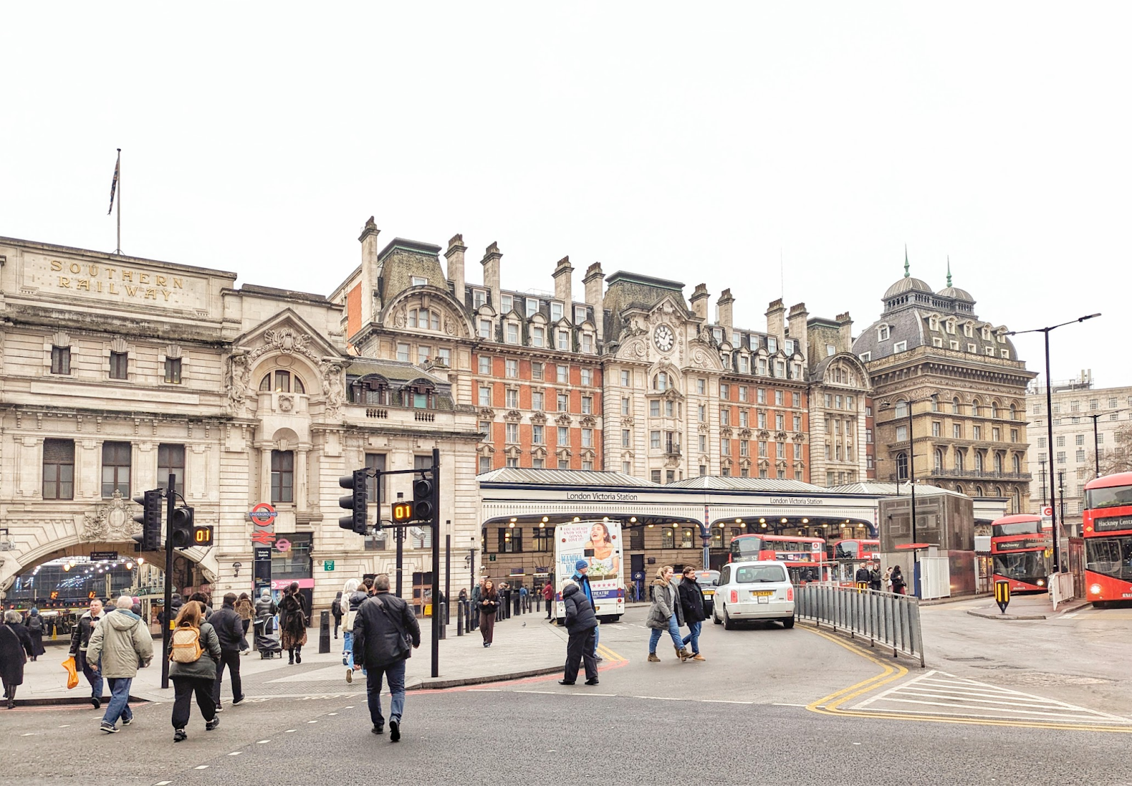 At last, we reach Victoria Station. Victoria Station is scarcely one of the beauties of London, and it has not yet received the sympathetic renovation that has so enlivened King’s Cross, Paddington and St Pancras, though one gathers that such a restoration is on the cards. For many years there were in fact two adjacent stations here, owned by different companies, one terminating the railway to Chatham, the other to Brighton. This division is still visible architecturally from Terminus Place: to the left is the handsome but lopsided facade of the Kent station, in an Edwardian mannerist style; recessed and to the right is the huge, heavy front of the Brighton station, dating from the same decade but in a French Renaissance style, with its lower storeys obscured by a projecting canopy. Finally there is the station hotel, with the square dome and arched windows: this is actually forty years older than the rest of the station complex, a survivor of the original station buildings from the 1860s.
