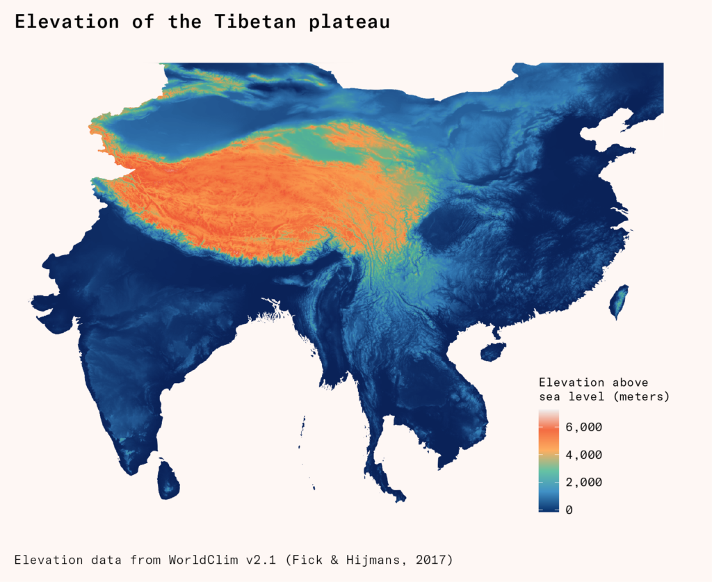This natural offset from seasonal demands, paired with the water being stored at high elevations, makes the plateau function as the ‘Water Tower of Asia’.