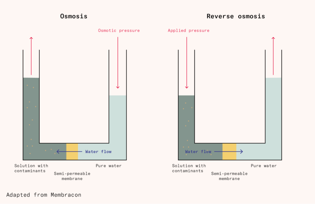 The second approach is reverse osmosis, which is the most intense form of membrane-based desalination. It uses high-pressure pumps to push saltwater against a membrane that has pores small enough for the water particles to pass through, but not the salts. This separates the water from the salt and other dissolved solids. As with distillation, the main problem with reverse osmosis is the energy cost. Running the pumps is expensive and energy-intensive. The size of the particles in the water is another challenge. Dissolved salts are among the smallest particles in water filtration, which means the pores in the membrane need to be extremely small. And the smaller the pore, the higher the pressure needs to be to push the water molecules through. Fortunately, advancements in membrane-based desalination technologies have reduced the cost of fresh water substantially, making desalination a viable option for many countries that were previously unable to afford it.