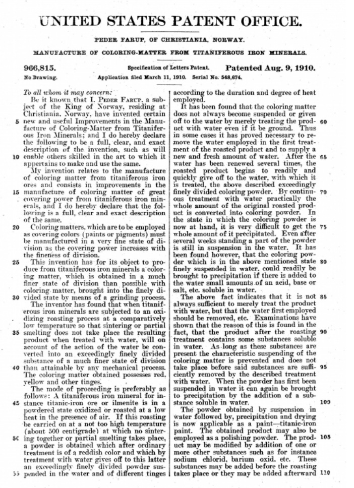 The breakthrough towards a white pigment and a substitute for lead would occur in 1909, when Peder Farup, a chemistry professor in Norway’s first technical school, tried to separate titanium from its ore. This followed a request from a government-backed committee; the new country, which had abundant iron ores of which titanium is a byproduct, was searching for uses. Farup noticed opaque red and yellow by-products: pigments.