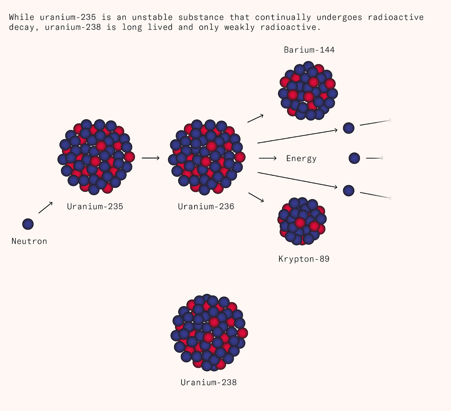 Uranium purified from ore consists of two isotopes – variant physical forms – in the proportions in which they are found today in nature: U 235, bomb material, an unstable substance continually undergoing radioactive decay, to the extent of seven parts per thousand; and U 238, stable ‘ordinary’ uranium, the preponderant balance. U 235 atoms spontaneously eject neutrons from their nuclei as they decay; collisions with atoms of a suitable moderator can slow some of those neutrons sufficiently to allow other uranium atoms to capture them and, in so doing, to fission; in fissioning – splitting – some of the matter of the uranium is converted into energy in the awesome proportions of Einstein’s famous formula. The fissioning of one uranium atom, minuscule though it is, produces enough energy to make a grain of sand visibly jump.