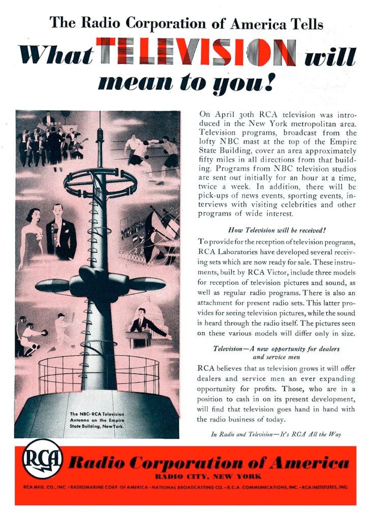 It’s a dilemma every new technology platform faces – only more so. To catch on, television needed to sell hardware, create content, and find revenue. Few contemporary platforms have to do all three. Most build on an installed base of hardware. Social media gets its content free from users. In theory, TV might have paid for programming with a license fee on sets, like the tax that still funds the BBC. But Americans, accustomed to free, ad-supported radio programming over public airwaves, fiercely resisted any such suggestion.