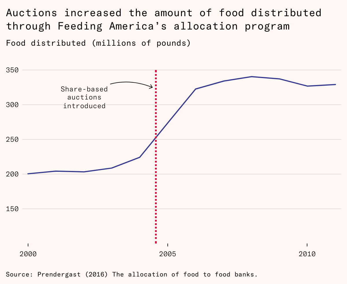 It also revealed how wrong the previous system’s assumptions were: auctions revealed that food banks were willing to trade 116 pounds of produce for a single pound of pasta.