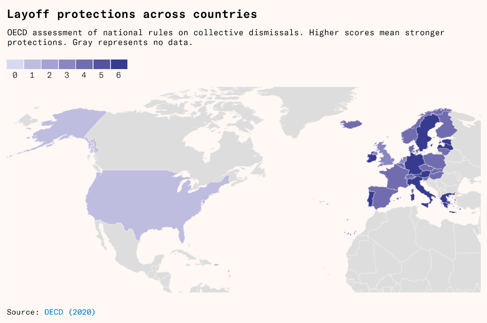 European labor law makes it very expensive for companies to fire people when business ventures fail. Compared with America, a large company has to pay over four times more in France and Germany to let someone go. That may sound like a good deal for workers, but it stops companies from taking risks, leading to less innovation, explains Pieter Garicano. That doesn’t mean Europe needs to copy the American model. Some countries, like Denmark and Switzerland, have systems that get the good parts without the bad.