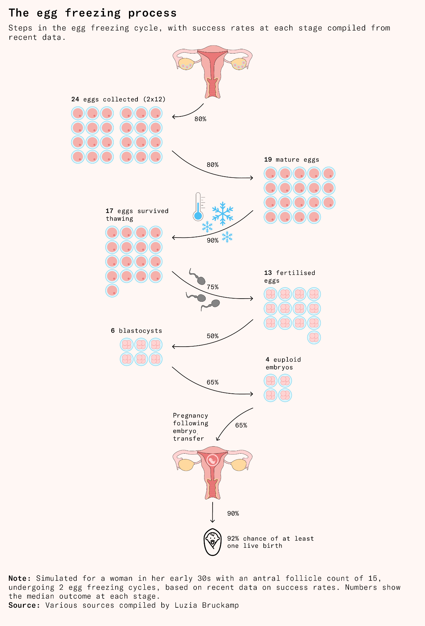 Public discussion of fertility is riddled with misconceptions. It is often claimed that the probability of conception declines slowly in a woman’s thirties and then drops off sharply; in fact it falls steadily with age. Readers of the New York Times or Vox have read that egg freezing barely works, but these facts come from a study of women who froze their eggs at an average age of 38, by which point their underlying fertility had fallen, which egg freezing cannot fix. When women in their twenties freeze their eggs, their success rates later on in life are closer to 85 percent. Ruxandra Teslo and Luzia Bruckamp explain why they chose to freeze their own eggs early, and why other young women should consider doing the same.