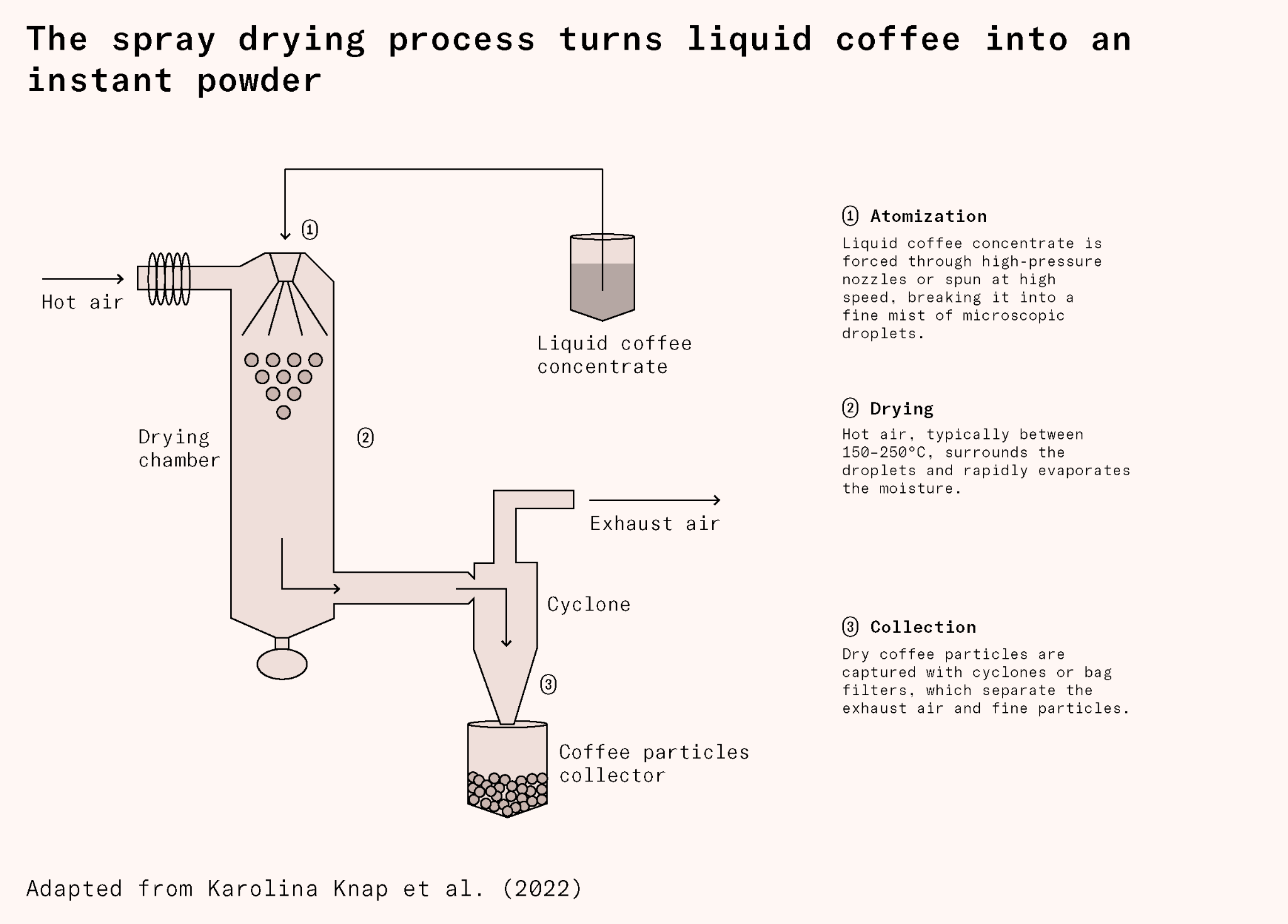 It’s extremely difficult to remove water from brewed coffee without destroying the flavours that make it worth drinking. Creating instant coffee was an odyssey that took centuries, Oscar Sykes and Benjamin Stubbing explain. Almost every early attempt was rancid. John Dring’s 1771 ‘coffee cakes’ of butter and tallow spoiled quickly, while the concentrates of the American Civil War tasted like ‘axle grease’. But the effort was eventually rewarded. In 1937, Max Morgenthaler, a Swiss chemist, developed the technique of spray drying, which, along with later innovations in freeze-drying and flash-freezing, is responsible for the delicious instant coffee we drink today.