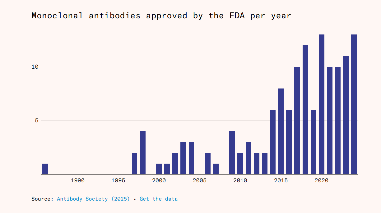 How to make an antibody by Alex Telford. Antibody treatments have only really matured over the past ten years or so, but have exploded in popularity. Four of the world’s ten best-selling drugs are monoclonal antibody treatments, including the biggest drug by revenue: Keytruda, used to treat solid tumors, which has been used to treat 2.5 million people so far. We seem to just be skimming the surface with what we’ve got, and Alex sketches out how we might be able to scale up these treatments to treat everything from malaria to influenza to snakebites.