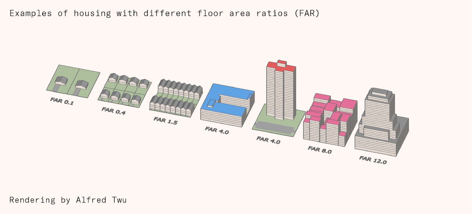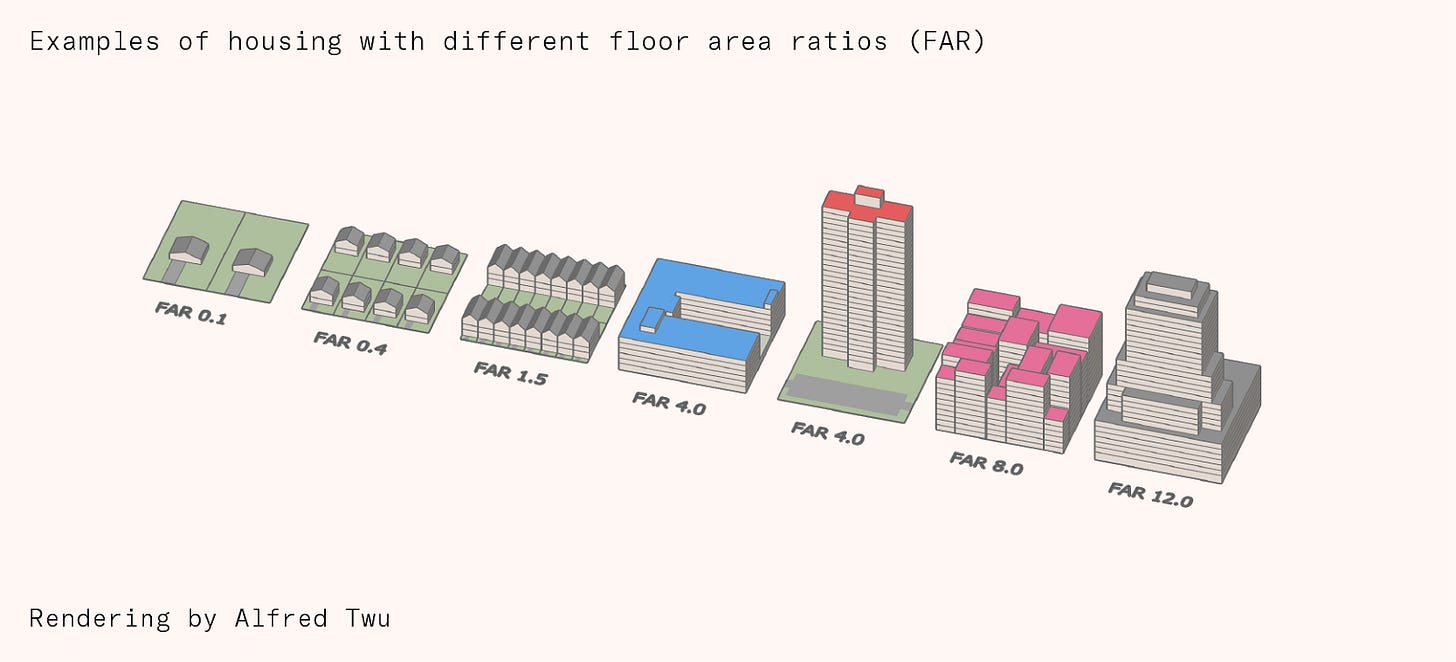 Chinese towers and American blocks by Alfred Twu. I learned a lot from this about the differences between American and Chinese urban forms. The arcology-like xiaoqu tower blocks that China is famous for are not, it seems, merely a product of Chinese cultural preferences, but strict regulations about how much sunlight apartment blocks must get. And their floor area ratios are not much different to much shorter and squatter 5-over-1s that are becoming ubiquitous in newer American developments. I was also interested to learn that 5-over-1s get their name not from being five floors of residential over one floor of commercial units, but in reference to the US building code, which classifies wood frames as Type V and concrete floors at Type I (5-over-1s were originally built with wooden frames over a concrete car park).