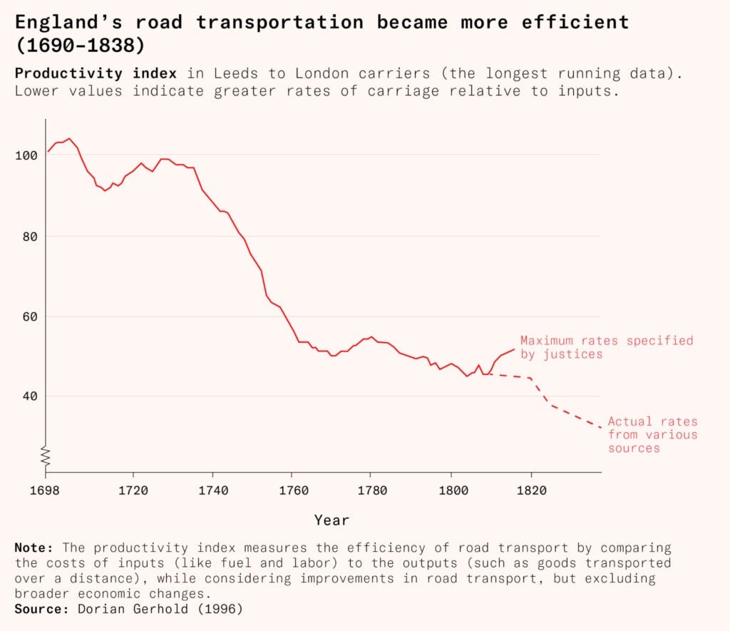 In fact, however, these improvements in speed greatly understate the overall improvement in transport. A train is not only faster than a stagecoach: it can carry vastly more stuff, be it freight or people. The key metric here is ‘cost per tonne per mile’. We don’t have perfect data on freight costs, but we can reconstruct a ballpark figure from what we know about passenger fares. A stagecoach fare between London and Brighton, 47 miles as the crow flies, varied between 276 and 144 pence in the early nineteenth century, equating to a per-mile-traveled cost of perhaps 2 pence. By the 1880s, first-class rail travel for such a journey would cost about 0.15 pence per mile traveled. This suggests a fall in overland per-tonne per-mile freight costs in the order of 95 percent, for a service that had also grown five times faster.