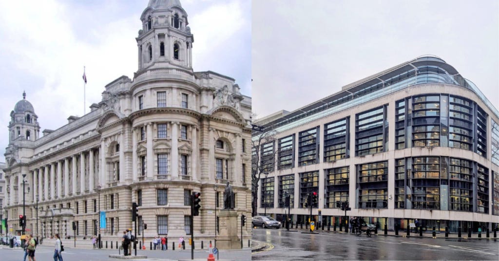 The reason is that there are some relatively budget pockets of the market where ornament has remained pretty common. Virtually any like-for-like comparison of an elite building from 1900 and today will show a huge reduction in ornament. Indefinitely many comparisons are possible, but here is one below, between a British Government office from the Edwardian period and one from the early 2000s.