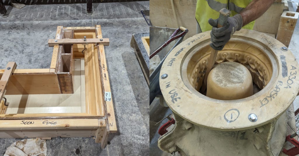 Another important material is cast stone. Cast stone is a kind of concrete, made by crushing stone, mixing the fragments (called aggregate) with a smaller quantity of cement as a binder, and then casting it in a mold. The crushed stone gives it an appearance resembling natural stone, an effect that is often augmented by mechanically tooling or etching the surface. Good cast stone is remarkably plausible: essentially no layperson would notice that it is not ‘real’, and even a specialist may struggle to tell if it is hoisted 80 feet up a facade. Simple molds are usually machine-carved in wood, and complex three-dimensional ones are themselves cast in gelatine or, today, silicone.