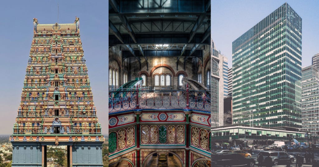 Ornament is amazingly pervasive across time and space. To the best of my knowledge, every premodern architectural culture normally applied ornament to high-status structures like temples, palaces, and public buildings. Although vernacular buildings like barns and cottages were sometimes unornamented, what is striking is how far down the prestige spectrum ornament reached: our ancestors ornamented bridges, power stations, factories, warehouses, sewage works, fortresses, and office blocks. From Chichen Itza to Bradford, from Kyiv to Lalibela, from Toronto to Tiruvannamalai, ornament was everywhere.