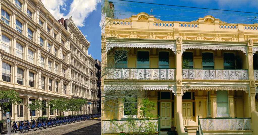 The second change revolutionizing ornament manufacture was that scientific advances improved the available materials. Improvements in metallurgy dramatically reduced the cost of cast iron in the early nineteenth century, and its use spread rapidly thereafter. New York City even went through a brief phase of making commercial buildings entirely from iron, many of which survive in SoHo. This proved to have practical problems like overheating, but adding cast iron ornament to masonry buildings became common in many places. Some cities, like Sydney and Melbourne, became especially known for their traditions of cast ironwork.
