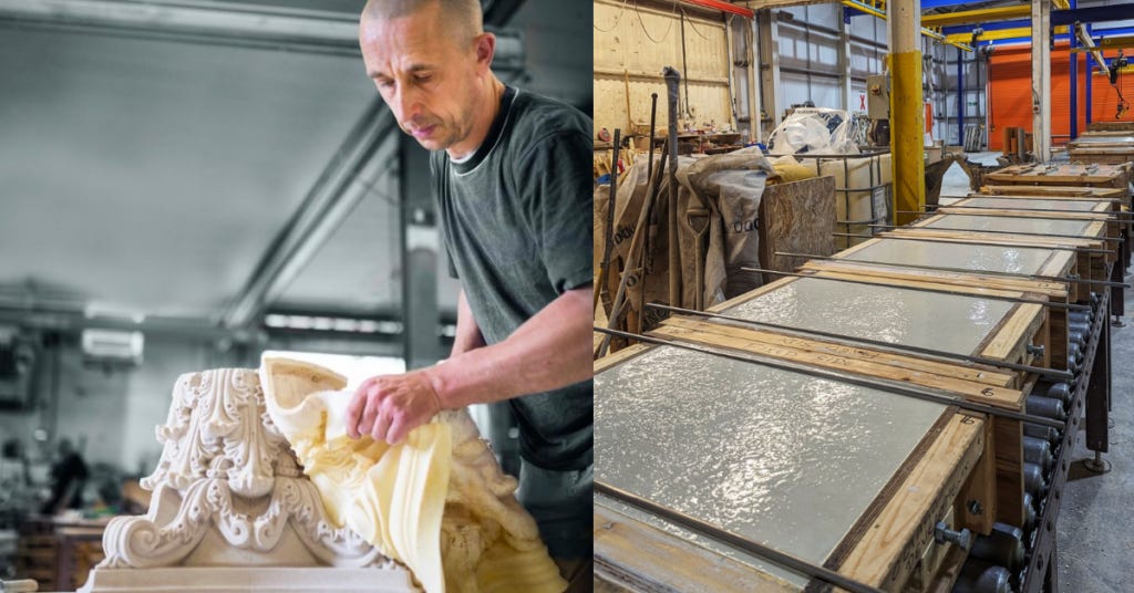 In fact, stonework is only finally being mechanized today. I recently visited what is probably the world’s most advanced factory for cutting stonework with a computer-controlled machine, Monumental Labs in New York City. Monumental Labs has constructed a robot that scans a model and then carves it from blocks of stone. The robot works about two to four times faster than a stone carver, and of course it works nonstop, meaning that its overall productivity is 6-12 times greater. It is capable of executing about 95 percent of the carving process, even for figure sculpture, where exact precision is particularly important. Unsurprisingly, Monumental Labs is quickly capturing market share from rivals who still do much of the work with pointing machines and hand carving. Over the next few years, they may succeed in finally mechanizing the process of stone carving. But this is only happening in the 2020s, after natural stone carving has undergone a long decline. So with respect to stonework, the supply-side story may have some validity.