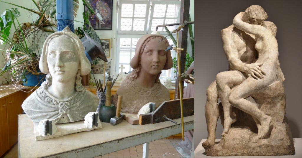 Even figure sculpture was produced using a version of this method: the sculptor would model the statue in clay, then craftsmen would transfer the design to stone, often via an intermediate plaster cast. The indirect carving of sculpture dates back to antiquity, and many of the most famous antique statues are Roman copies of Greek originals, including the Apollo Belvedere and the Venus de Medici. Indirect carving faded away in the Middle Ages but was revived in the Renaissance and improved steadily in the following centuries. Initially, indirect carving was used to get the figures roughly right, after which the sculptor would take over to execute the details. But by the later eighteenth century, pointing machines were so good that many sculptors did little work on the actual statue: sculpting was basically an art of modeling in clay, and carving was a sophisticated but largely mechanical process. Canova, Thorvaldsen, and Rodin all worked this way. The stone sculptures that adorn the centers of old European and American cities are mostly stone copies of plaster copies of long-lost clay originals.