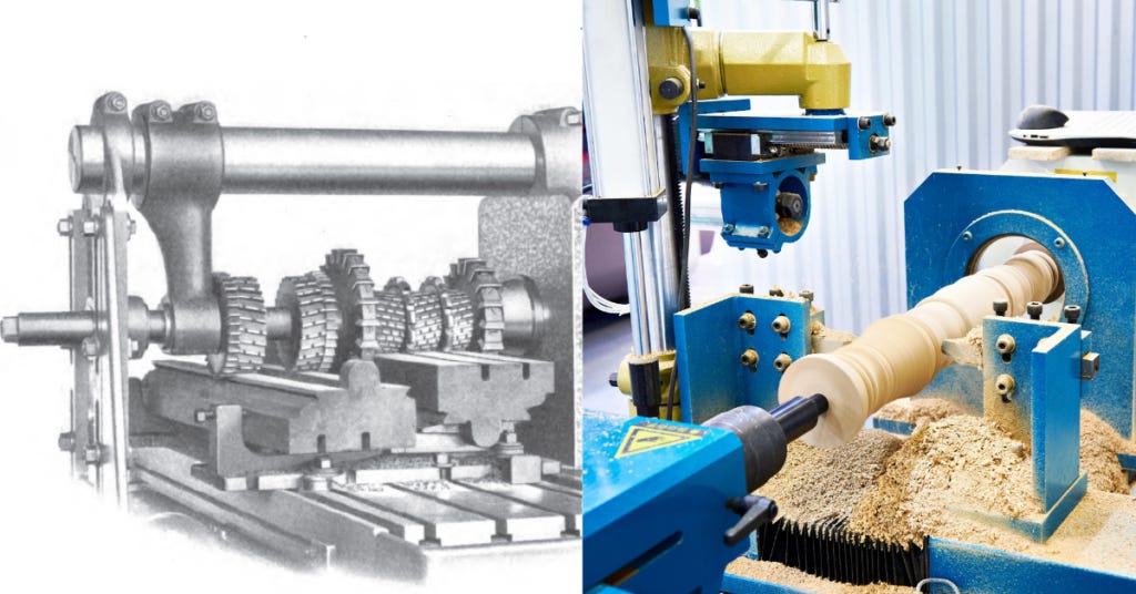 In the case of woodwork, however, mechanization was extraordinarily successful. Two key innovations were steam-powered milling machines and lathes in the nineteenth century. A milling machine has spinning cutters shaped like the negative of the desired profile of the molding. When a beam of wood is passed through it, the cutters remove exactly the correct volume of wood, and an essentially finished ornament emerges on the other side, with many hours of manual carving work completed in seconds. A lathe works on a modification of the same principle: the piece of wood is spun, and the blade is held steady. It is used for things like balusters and columns. Lathes, unlike milling machines, had existed before the Industrial Revolution, but steam made them much more powerful.