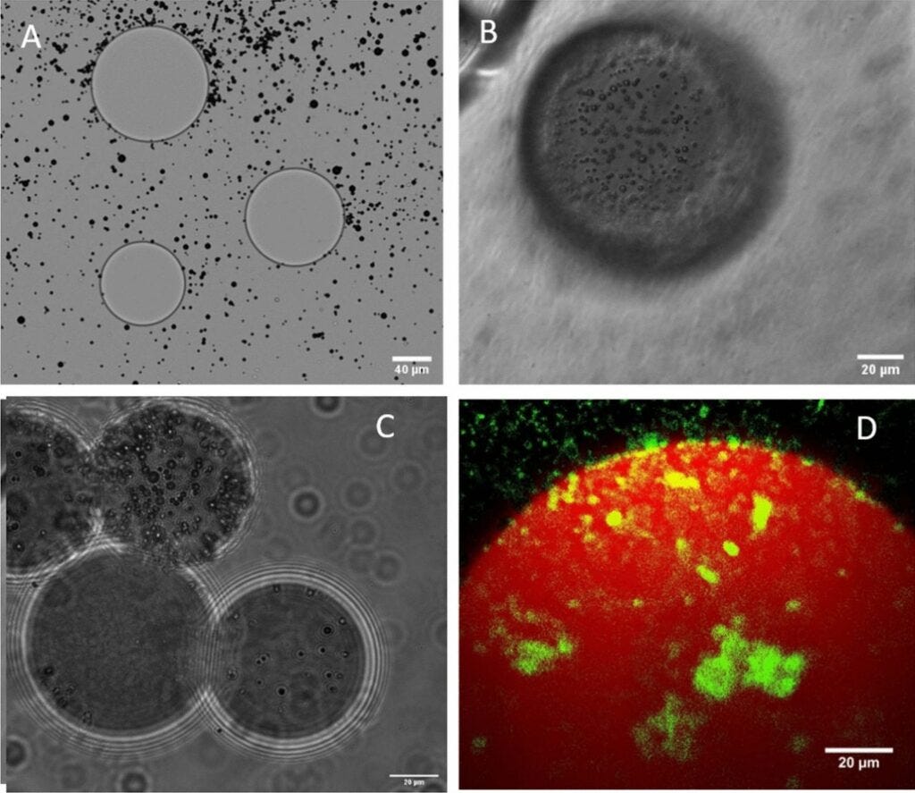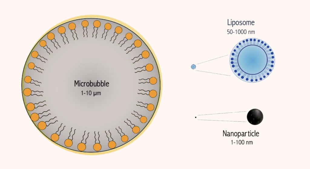 Microbubbles are just what they sound like: tiny gas-filled bubbles. Scientists have engineered them further, to be coated with a protective outer shell and made capable of carrying drugs or genetic material to cells in the body. They are microscopic, roughly the width of spider silk, but still hundreds or thousands of times larger than nanoparticles or liposomes. This means they’re too large to leave the bloodstream. Instead, microbubbles deliver drugs by bursting on command.