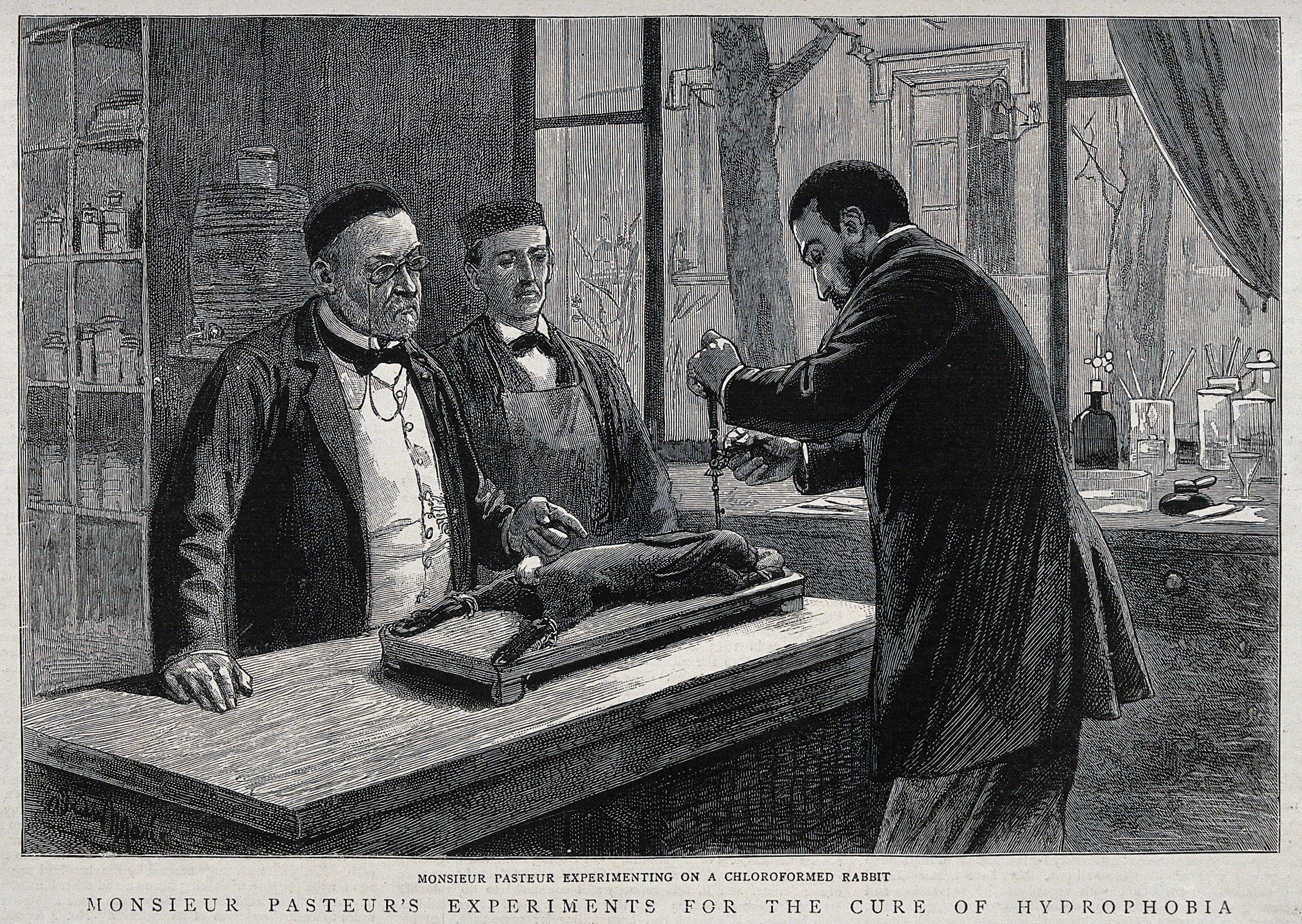 Then they developed another, against animal anthrax, this time inactivating the bacteria with chemicals, before turning to one of the deadliest diseases: rabies. Almost everyone who developed symptoms from a rabid animal’s bite died within weeks, but its microbial cause was unclear. The rabies virus, like other viruses, was too small to be seen under microscopes of the time. But Pasteur and Roux reliably found that brain tissue from a rabid animal could cause rabies in another animal.