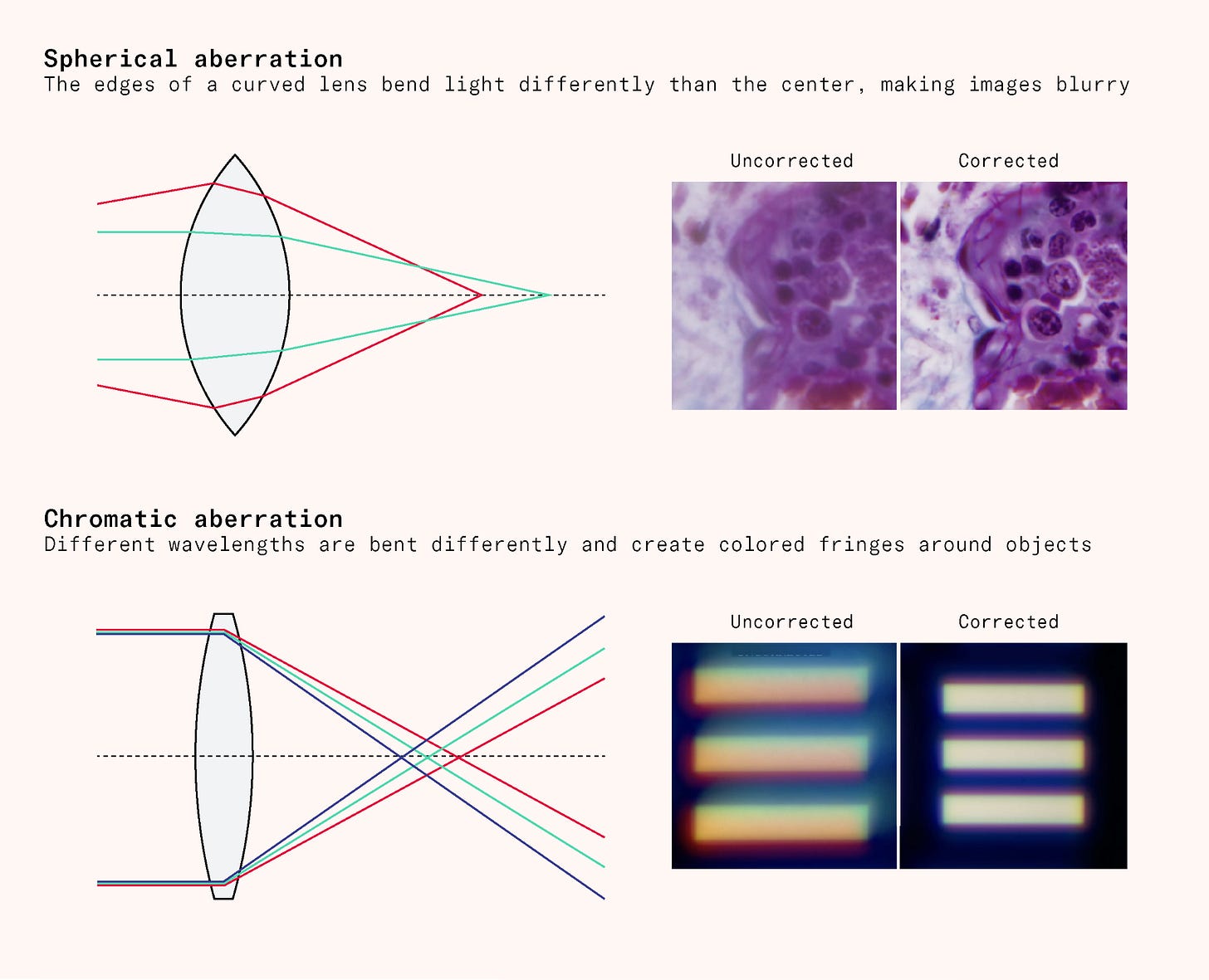 Various innovations were needed to make microscopes more precise. One step came in 1830 from the wine merchant JJ Lister, who studied lens making as a hobby. By varying the distance between lenses, he worked out how to develop achromatic and aplanatic lenses, which reduced color and spherical aberrations, respectively.