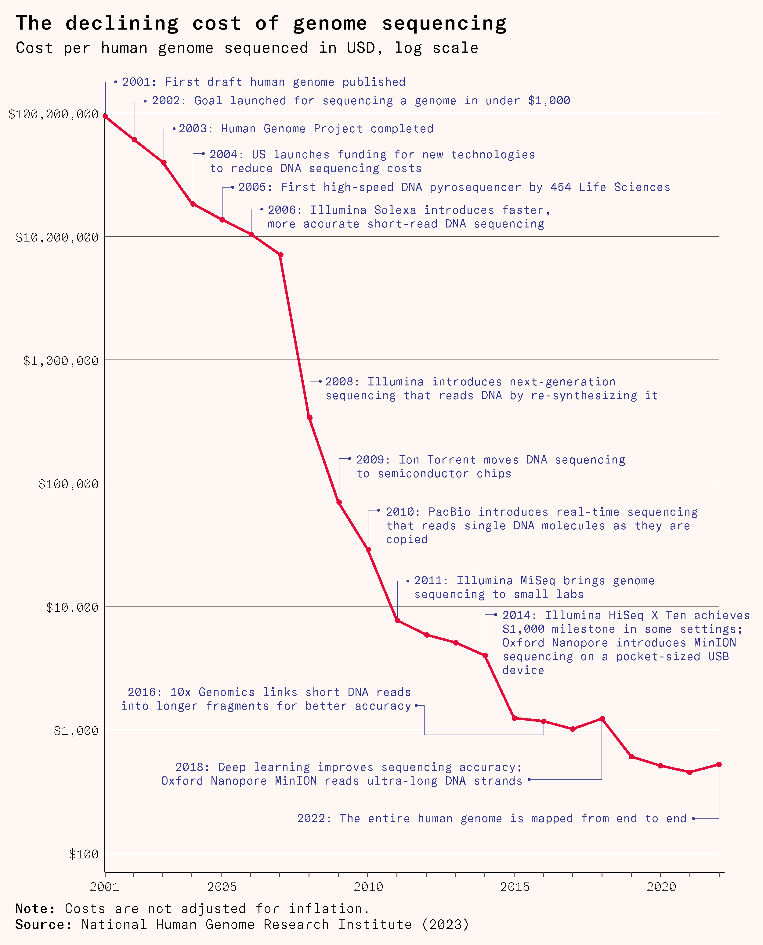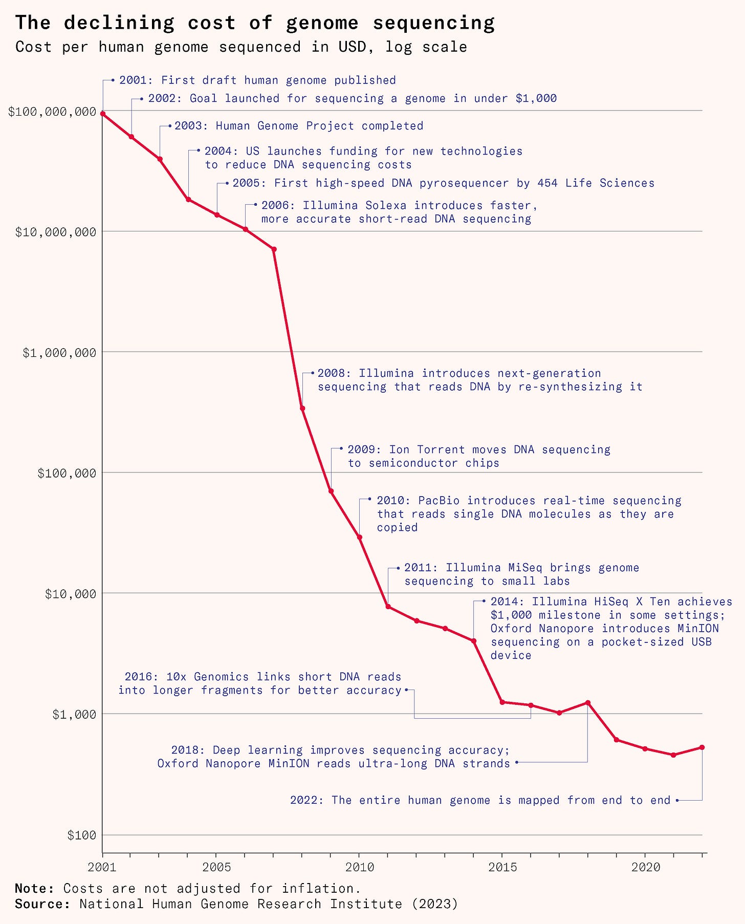 In the 1970s, it took weeks or months to laboriously decode the sequence of a single gene. Even in the 1980s, after automated sequencers were introduced, it took days per gene. But by the 2010s, propelled by the Human Genome Project, scientists could read entire genomes in the same amount of time with new sequencers, at a tiny fraction of the cost. Since then, some sequencing devices have been made so compact they can be plugged into a computer like a USB stick.