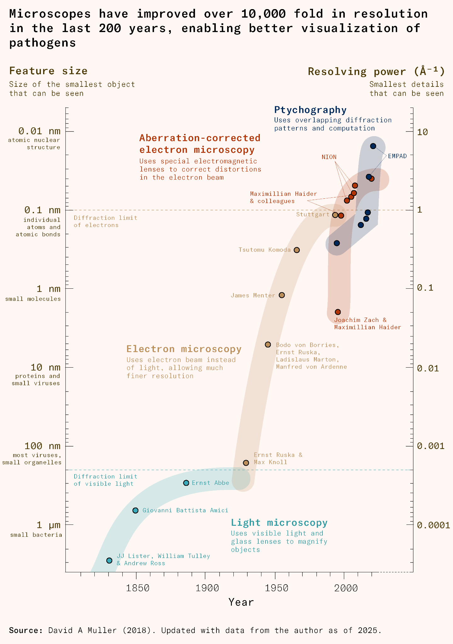 Fortunately, microscopes had been undergoing a revolution of their own. Over two hundred years, their resolution would improve more than ten thousandfold, allowing scientists to examine not only cells, but bacteria, then viruses, their protein structure, and, eventually, the individual atoms that comprised them.