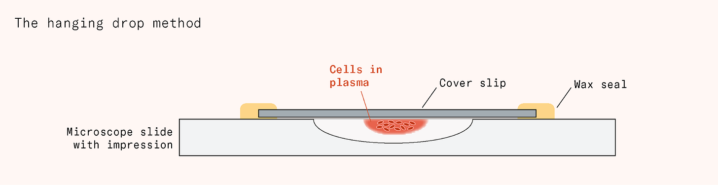 The next step forward came from neuroscientist Ross Harrison in 1907, who developed the hanging drop method. He took a piece of spinal cord from a frog embryo and put it in a drop of its plasma, placed it on a thin glass coverslip, inverted it over a concave slide, and sealed it with wax – creating a drop that hung suspended and stayed moist and rounded while the plasma provided nutrients and structure. The nerve fibers stayed alive, growing for weeks.