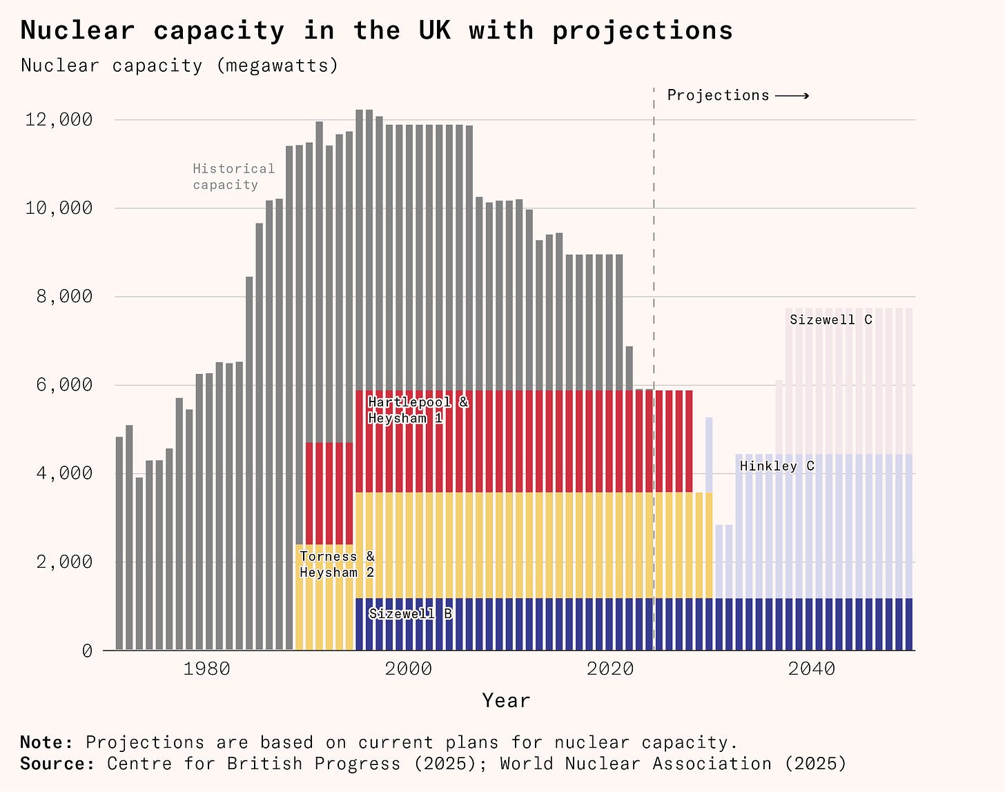 By 1965, Britain had built more nuclear power stations than the US, USSR, and France combined. Stations were approved in months, regularly built in under five years, and operated with an impressive safety record. But in 1970, the UK’s lead faltered and has never recovered.