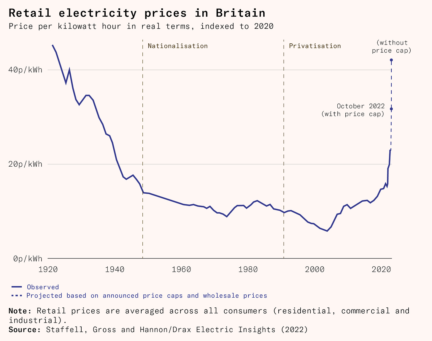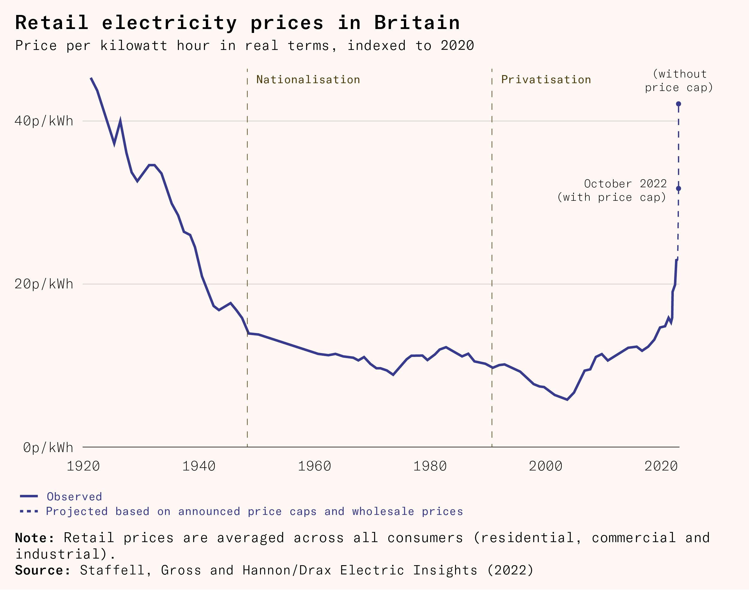 By the late 2000s, concerns about climate change and rising gas prices led the government to return to nuclear power as an option. EDF revived the idea of building a third nuclear power station at Hinkley Point. Instead of investing directly, the government committed to pay a fixed, inflation-protected price of £92.50 per megawatt-hour generated in 2012 money, or £133 in 2025 pounds. This was significantly higher than the wholesale price has ever been since the electricity market was created, except during the crisis caused by Russia’s invasion of Ukraine.