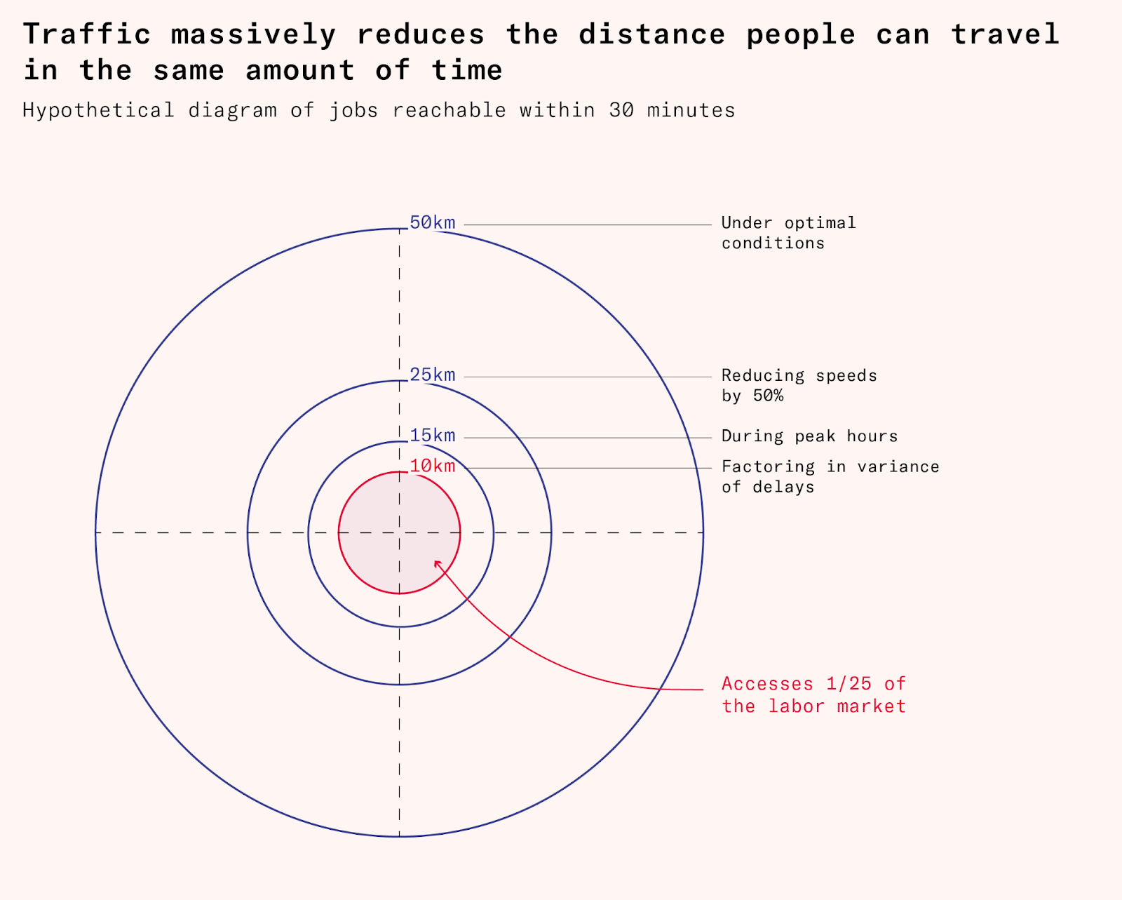 Poorer residents instead make most of their trips on foot, and are thus shut off from the larger labor market entirely. The average amount of traffic slows everyone down. But a commuter who wants to be on time for work can’t expect the average amount of traffic every day – they have to also care about the variability in trip times. In order to avoid being late to work once a week, a person may thus have to show up early most days. While data for this is sparse, one study on three-wheel taxi (a popular and relatively affordable form of transportation) trips in Bardoli, a small city in Gujarat with a population of 476,000, found that 95th percentile travel time was about 40 percent longer than the average.