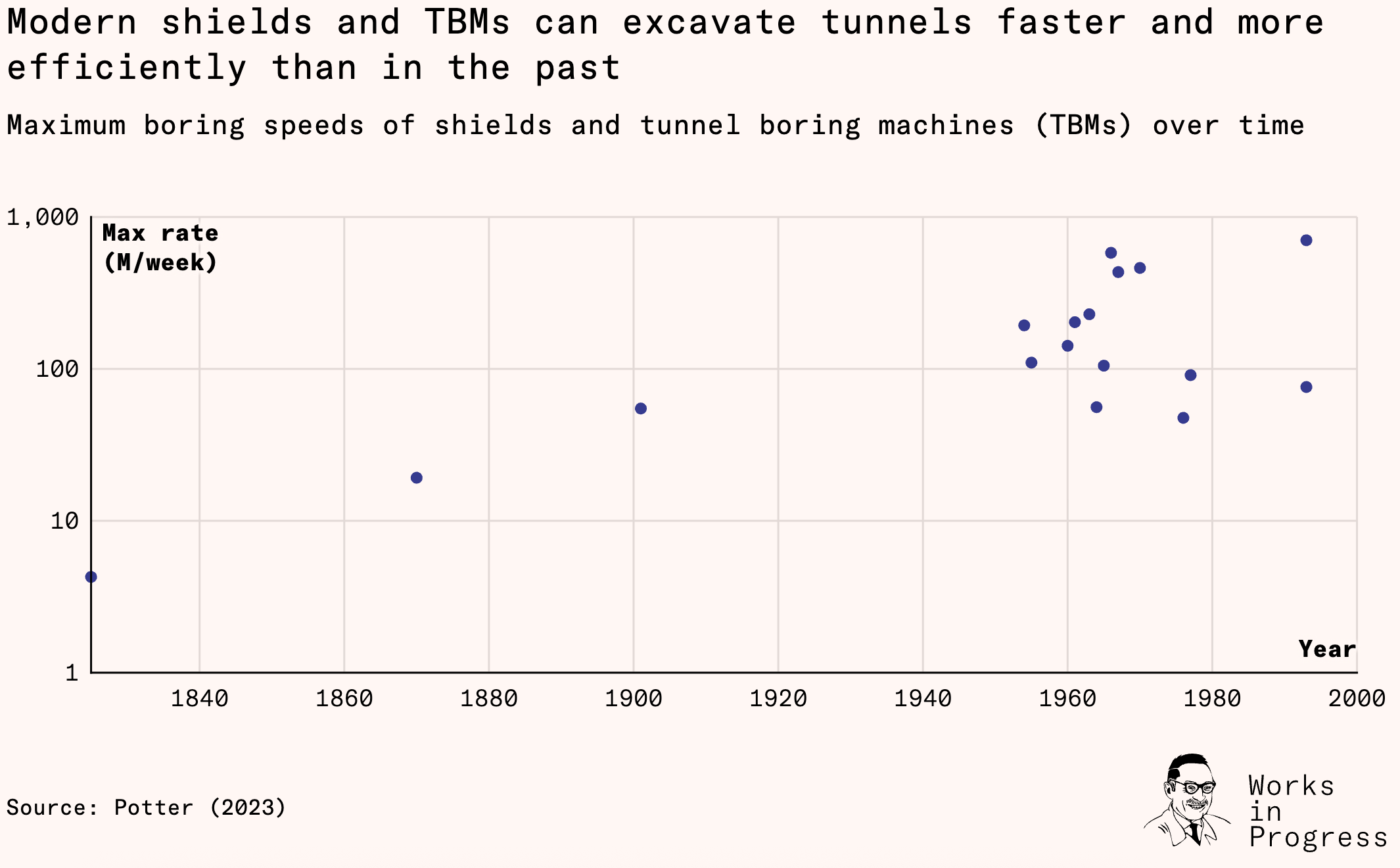 But as tunneling machine technology continued to advance, this calculus changed. Brunel’s non-mechanized shield tunneled under the Thames at the glacial pace of eight feet per week. By the early 1900s, Price mechanized shields were achieving excavation rates of nearly 200 feet per week. And by the 1970s, TBMs were achieving rates of 1,400 feet per week in soft ground, and 1,900 feet per week in rock.