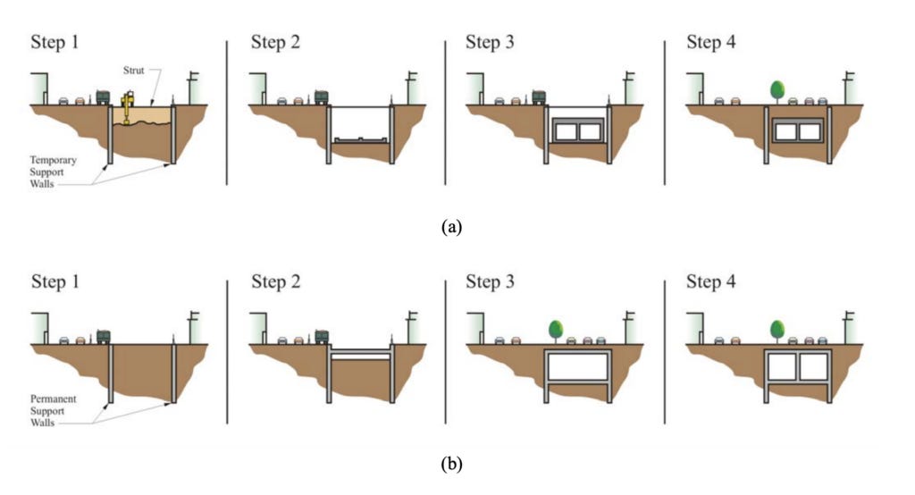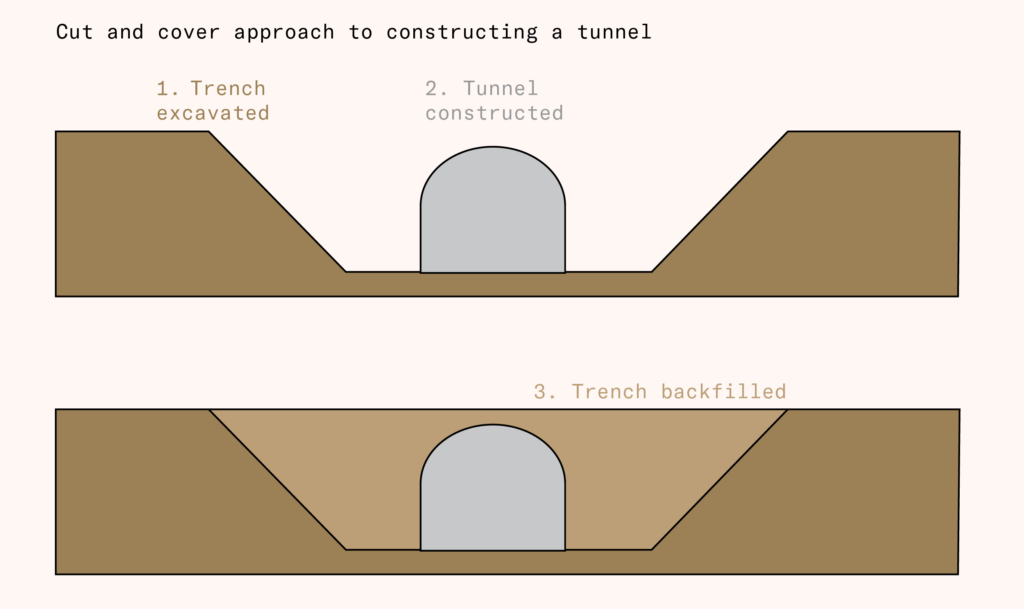 Cut and cover can also cause subsidence in the ground surrounding the excavation site, damaging surrounding buildings. TBMs will sometimes be chosen as the excavation method even when they’re more expensive purely to reduce this risk.