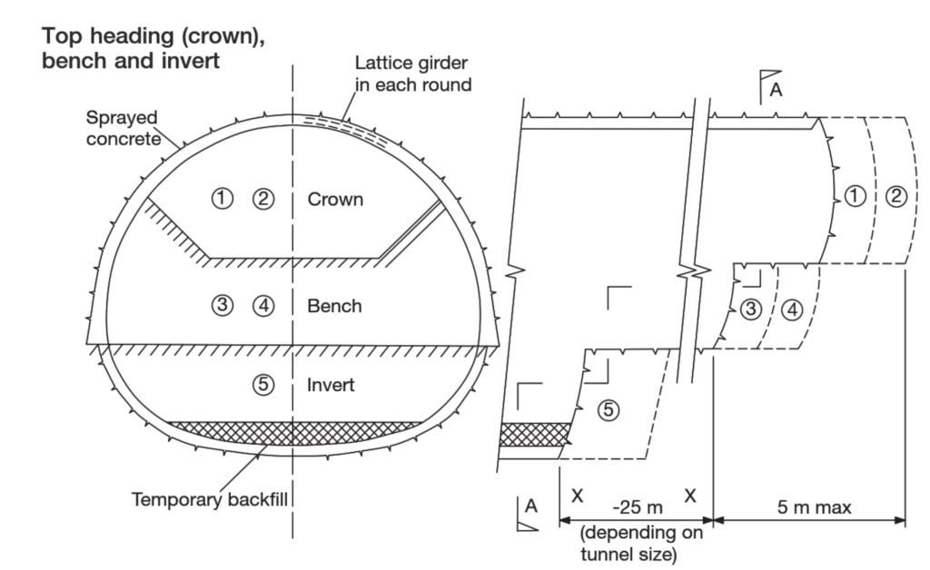 The sequential excavation method (SEM), also known as the New Austrian tunneling method, excavates a tunnel in small ‘bites’ using mechanical excavators and other equipment, and supports the sides of the tunnel using shotcrete.